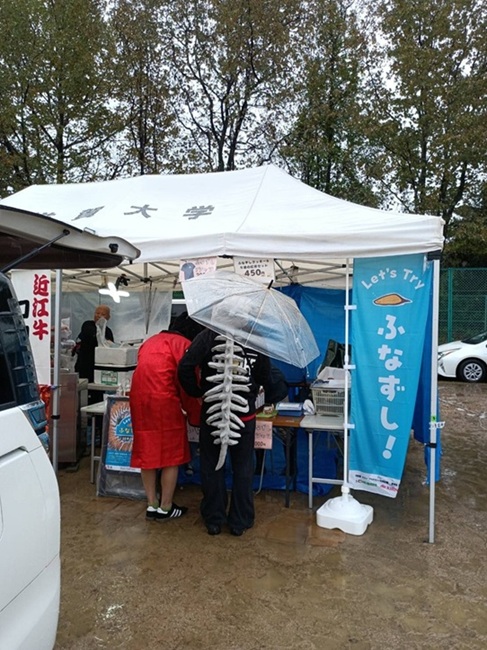 10月26日は、ふなずし試食会の第1回目ということで、滋賀大学彦根キャンパスの学園祭で行いました。試食会と言っても、「くさい・食べにくいもの」というイメージの食べ物に対する心理的ハードルを下げるために、ふなずしそのものをいきなり提供するのではなく、