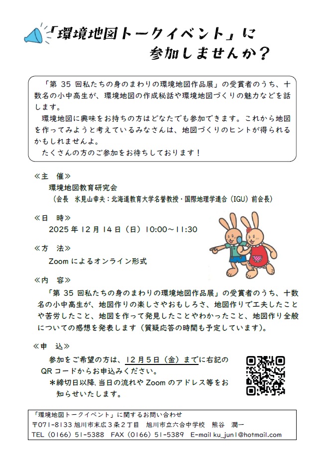 地図展は終了しましたが、今年入賞したみなさんに地図作品の作成秘話や地図づくりの魅力などを発表してもらう環境地図トークイベント(オンライン)を12月14日に予定しております。皆さんの参加をお待ちしております。