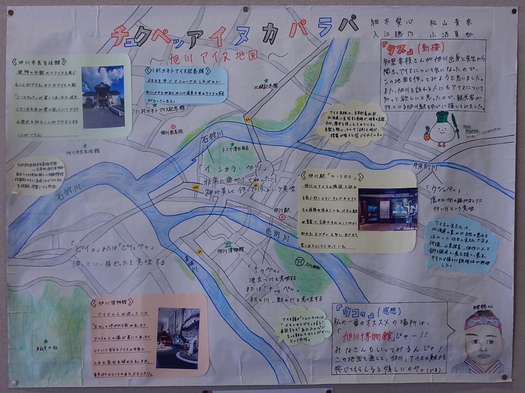 作品タイトル:チュクペッアイヌカパラパ~旭川アイヌ地図~ 氏名:細木 愛心,松山 青奈,入江 穂乃,小沼 夏帆 学校名:北海道旭川西高等学校 学年:2 |