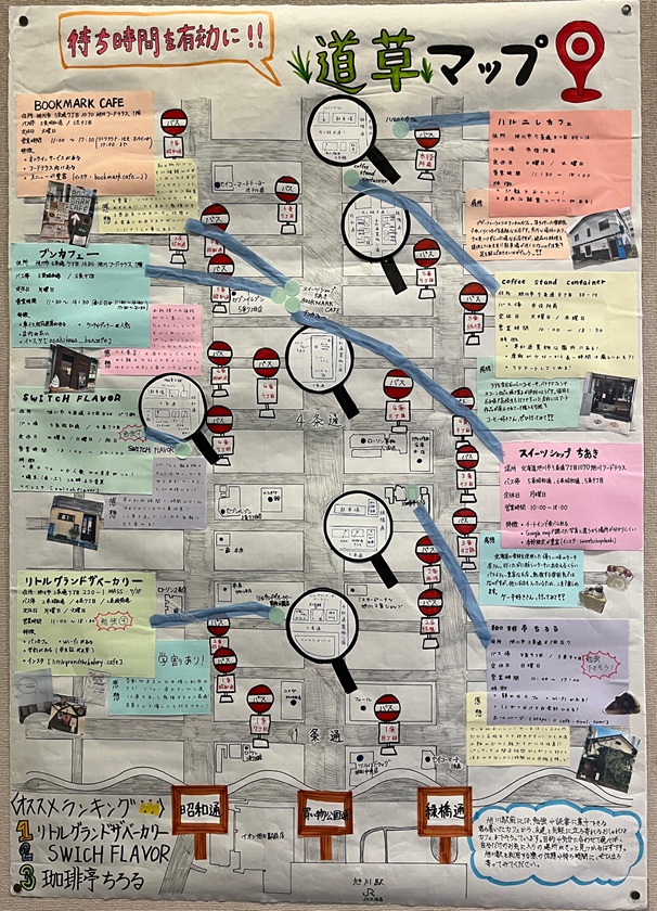 作品タイトル:待ち時間を有効に!! 道草マップ 氏名:高石 美春,嶋貫 莉子,宇佐美真佳 学校名:北海道旭川西高等学校 学年:2 |