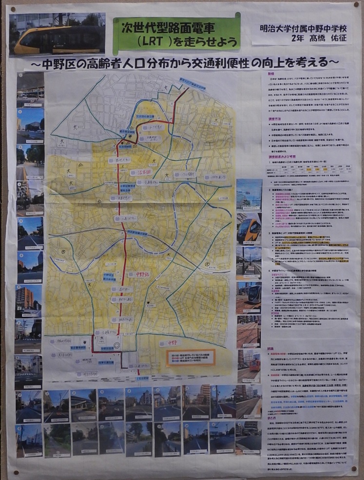作品タイトル:次世代型路面電車(LRT)を走らせよう ~中野区の高齢者人口分布から交通利便性の向上を考える~ 氏名:高 橋 佑 征 学校名:明治大学付属中野中学校 学年:2 |