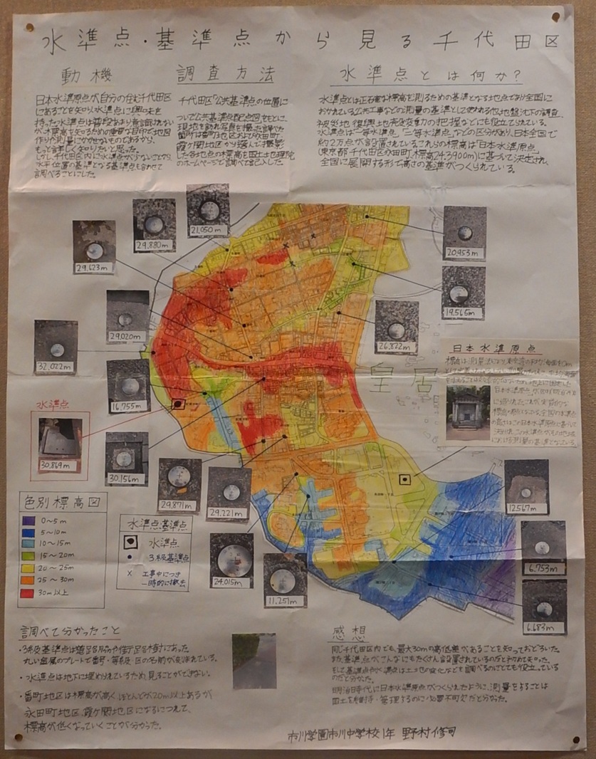 作品タイトル:水準点・基準点から見る千代田区 氏名:野 村 修 司 学校名:市川中学校 学年:1 |