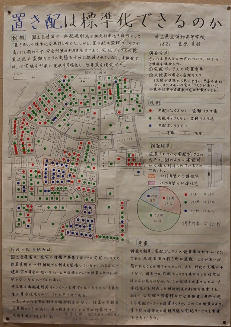 作品タイトル:置き配は標準化できるのか 氏名:菅 原 圭 悟 学校名:埼玉県立浦和高等学校 学年:1 |
