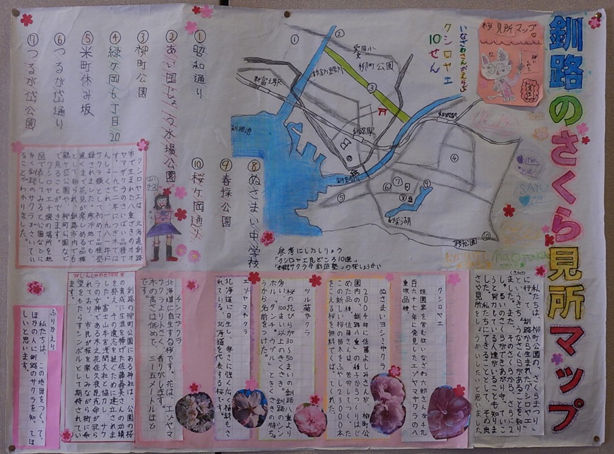 作品タイトル:釧路のさくら見所マップ 氏名:安孫子直宜,加藤 凜朱,小林 流維,佐伯 和音,丹羽恭一郎,渡辺 紗由 学校名:釧路市立愛国小学校 学年:3 |