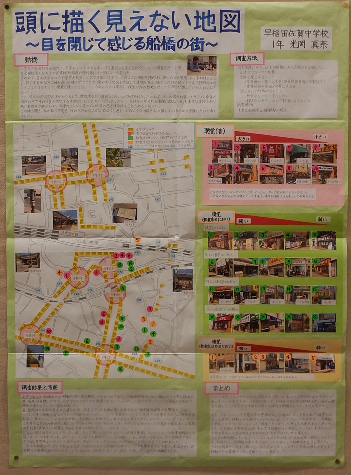 作品タイトル:頭に描く見えない地図~目を閉じて感じる船橋の街~ 氏名:光 岡 真 奈 学校名:早稲田佐賀中学校 学年:1 |